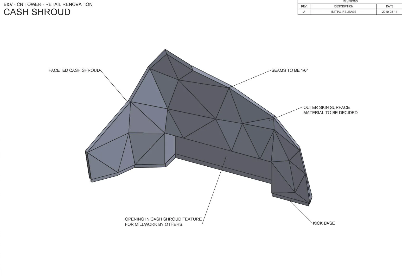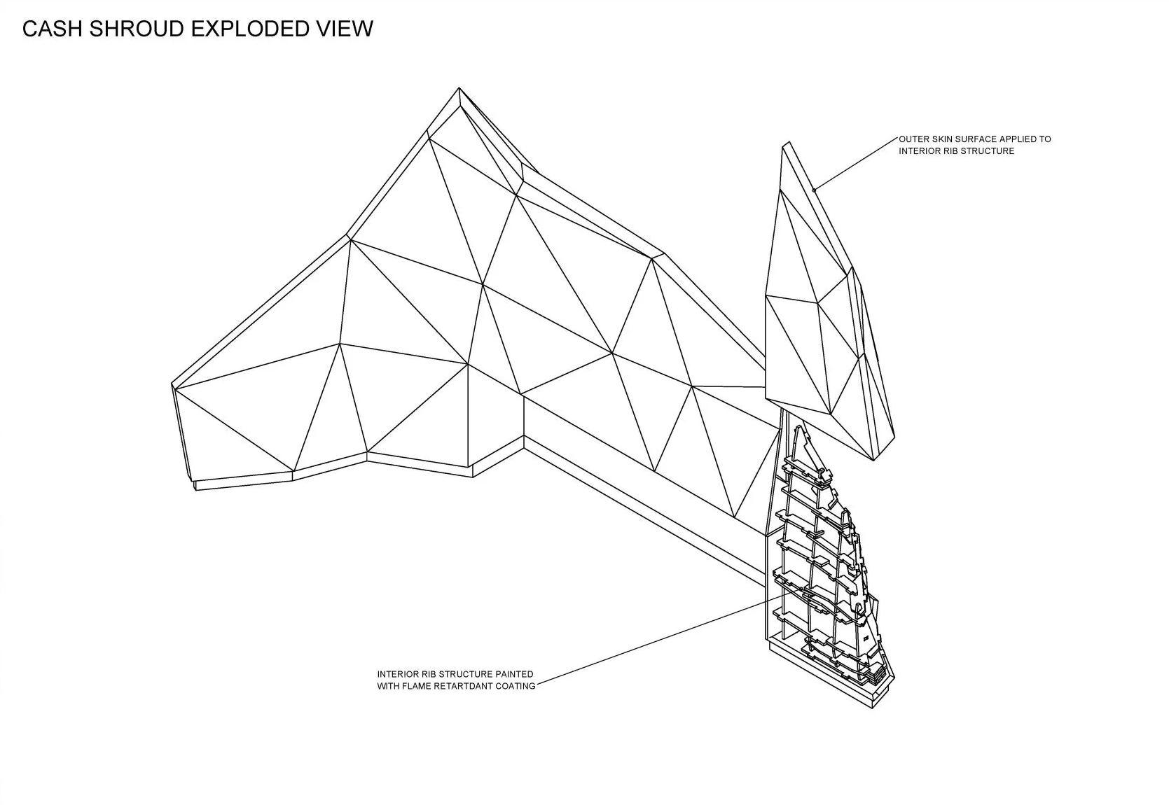 The City Grid is the centerpiece of the retail concept. Integrate with lights and product displays, it is two stories tall and built using a tube-laser. The Cash Shroud’s are identical mirror-images, built using precise digital fabrication techniques on a 5-Axis CNC machine.
