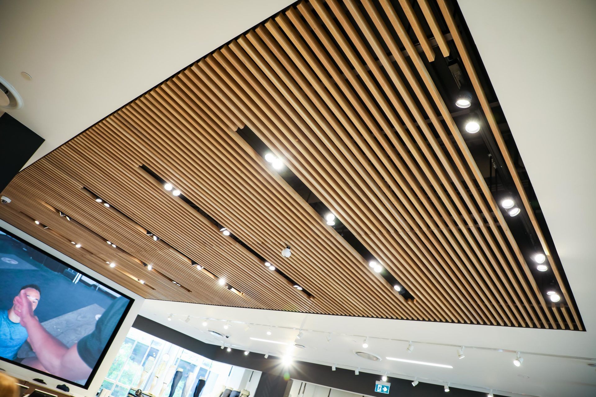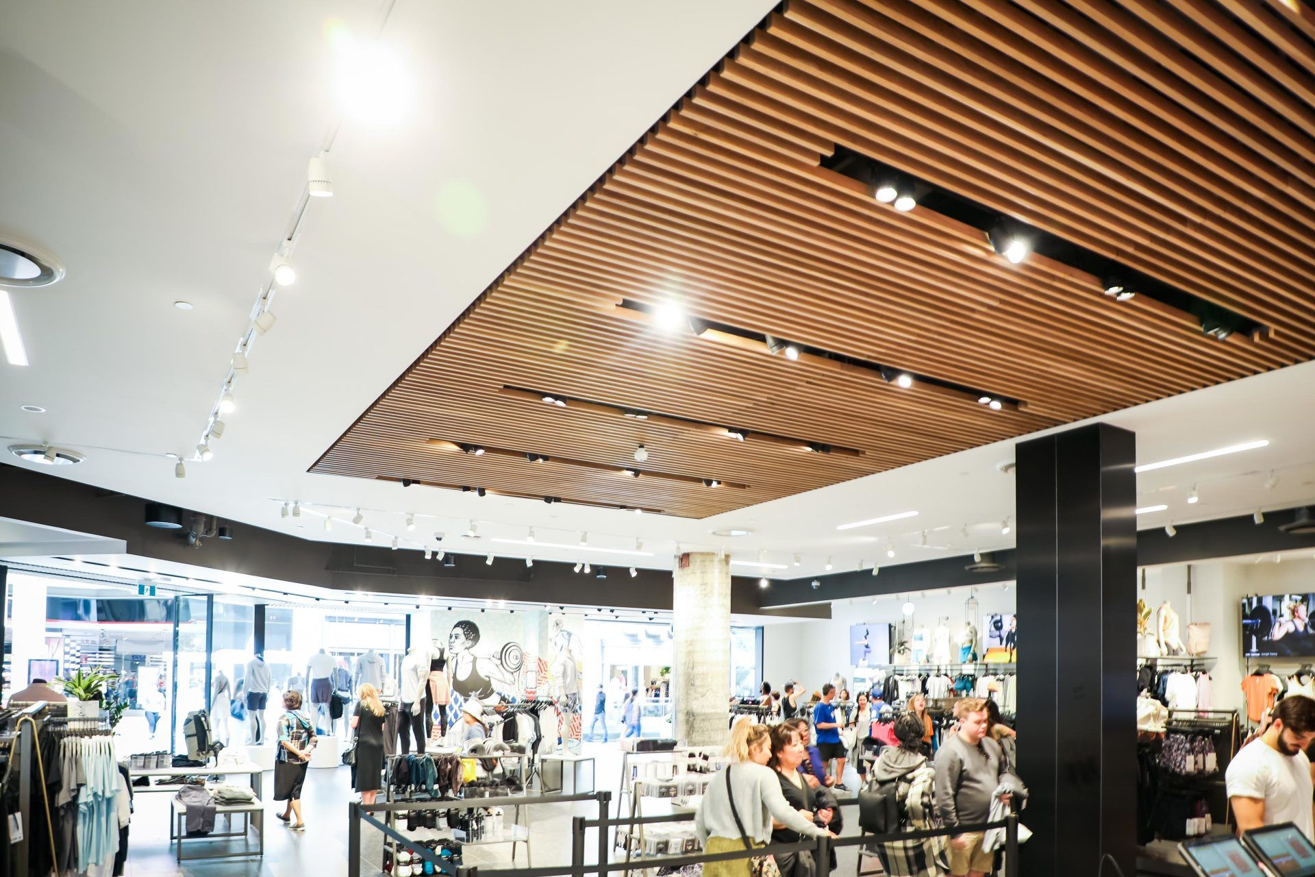 The exterior of the Lululemon store in the Eaton Center features a wood slat fascia above all entrances as well as the atrium which overlooks a mall entrance. The wood used for the façade reflects a focus on sustainability and nature. Inside the store, another wood slat ceiling feature is display at the POS to further bring the motif of nature into the retail space.