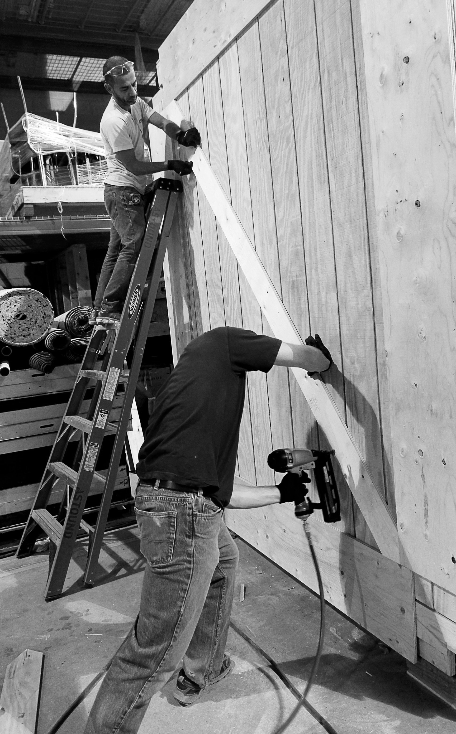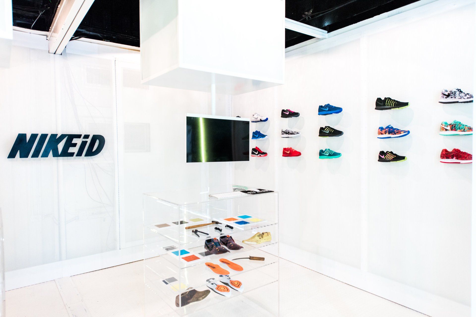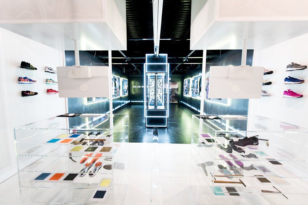 The crate itself was fabricated from the shells of used shipping containers; customized, clad, and stacked to create a 20’H x 16’W x 40’L interior online shopping experience with product and innovations displays, as well as interactive Nike ID shopping stations.