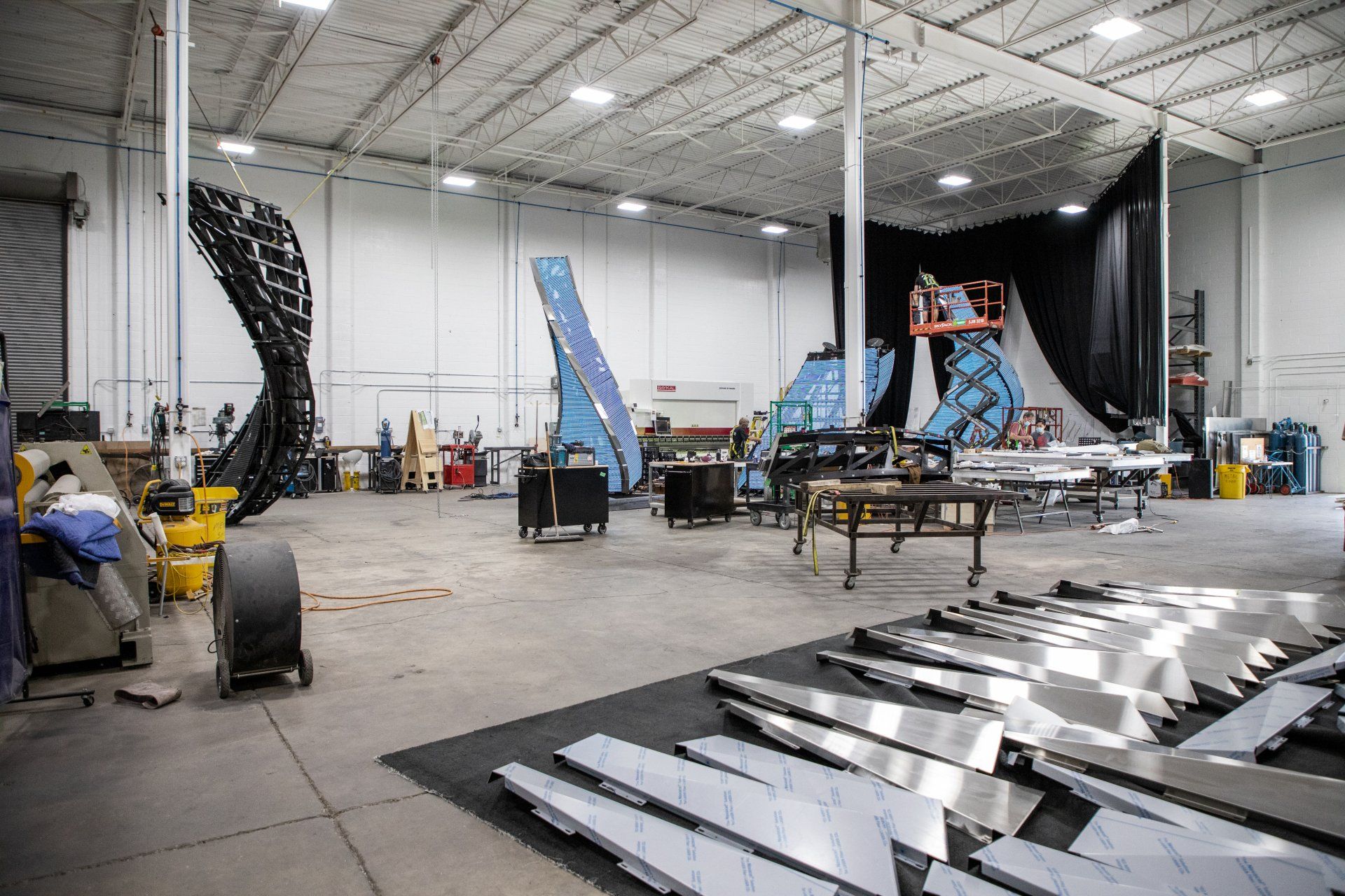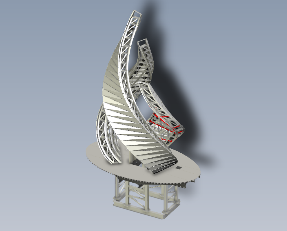 Several scale models were created to communicate a few different details and options for features like the material finishes, exterior faceting, and LED integration. The three separate flame pieces are all constructed with a structural steel sub-frame with integrated supports for the LED carriers and exterior panels. Once completed, the LED bars integrated throughout the sculpture will be mappable to run lighting programming and custom digital content.