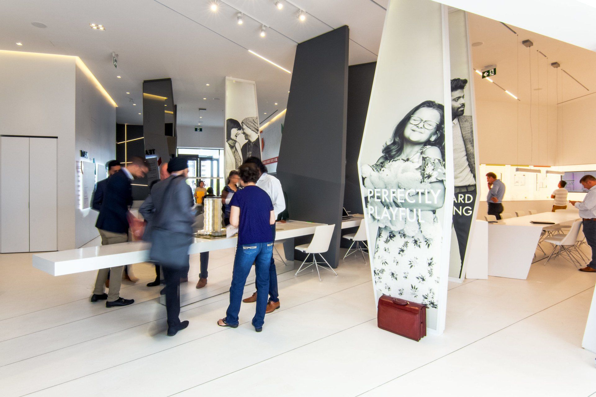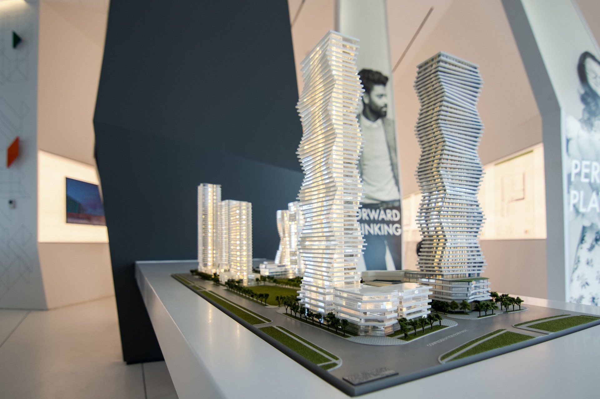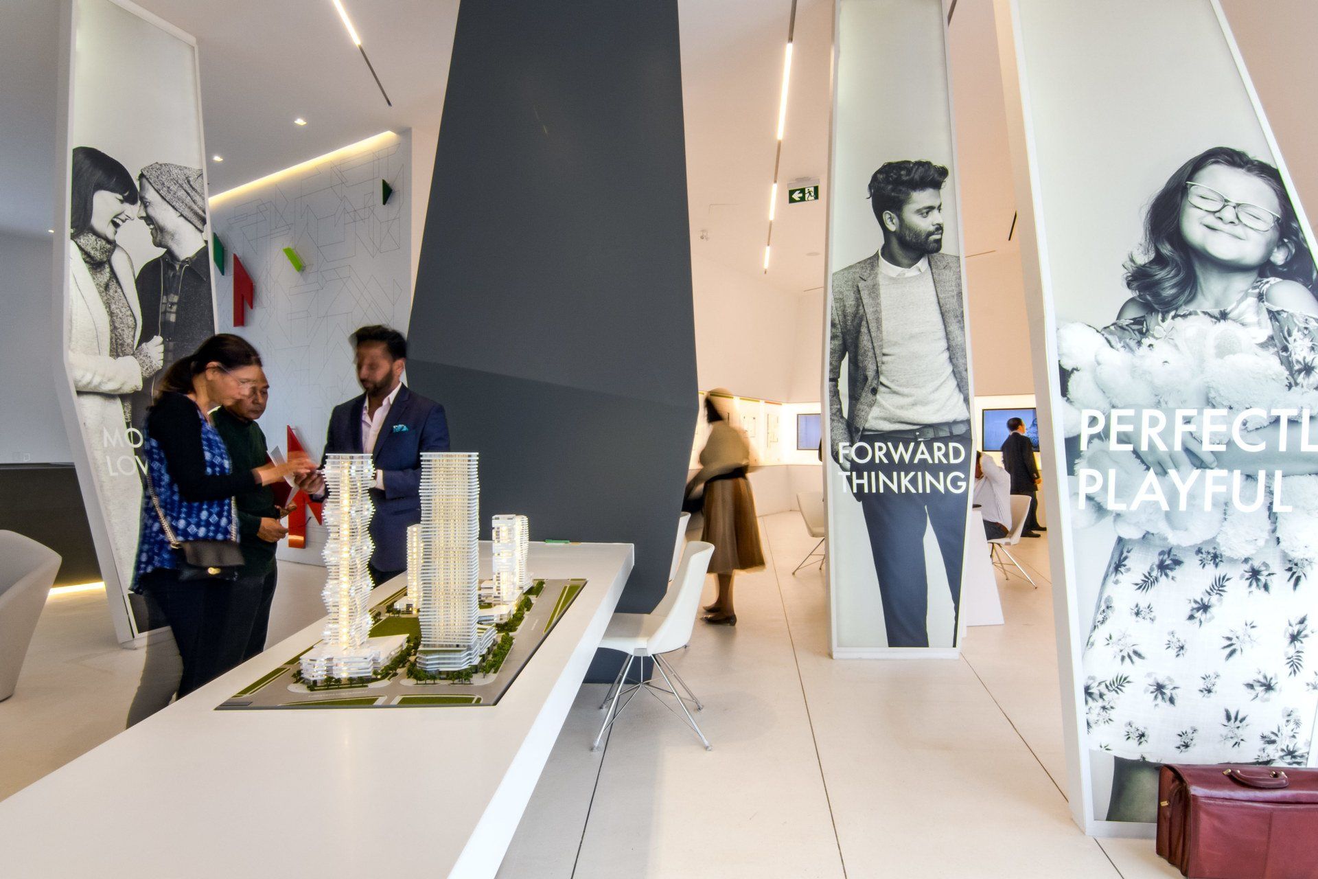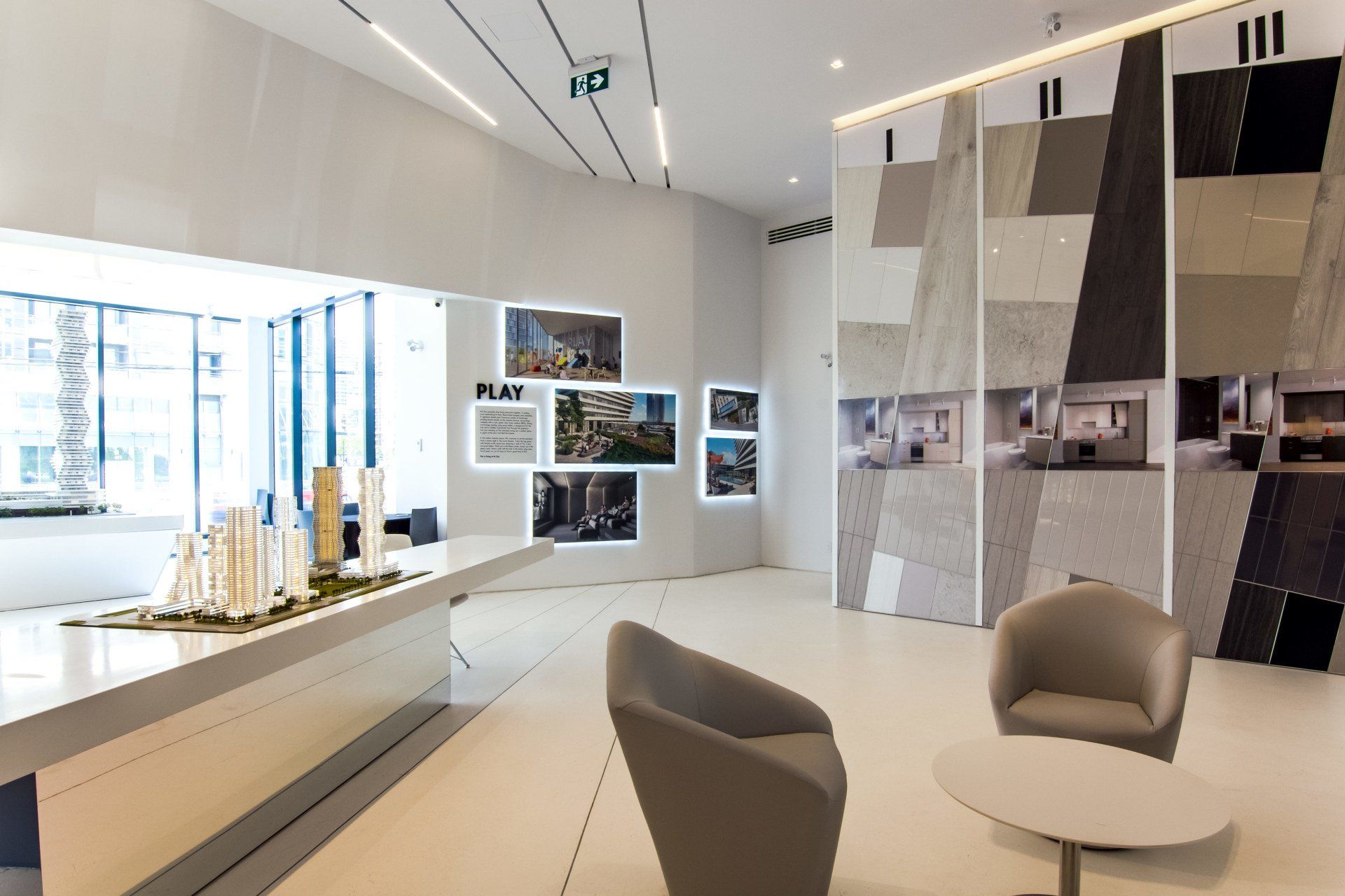 The design of the interior and exterior of the centre was intended to reflect the overall look-and-feel of the proposed condominiums so that prospective buyers could envision the community prior to completion. Upon entering, visitors were greeted at the reception desk where they confirmed their meeting time with the receptionist or proceeded to browse the space. Within the space, visitors could investigate two scale models of the condominium buildings which were housed atop custom cantilevered tables. A variety of floorplans were displayed on a custom light wall feature for visitors to browse. For meeting purposes, there were a number of presentation units and meeting areas for private viewing and conversations.